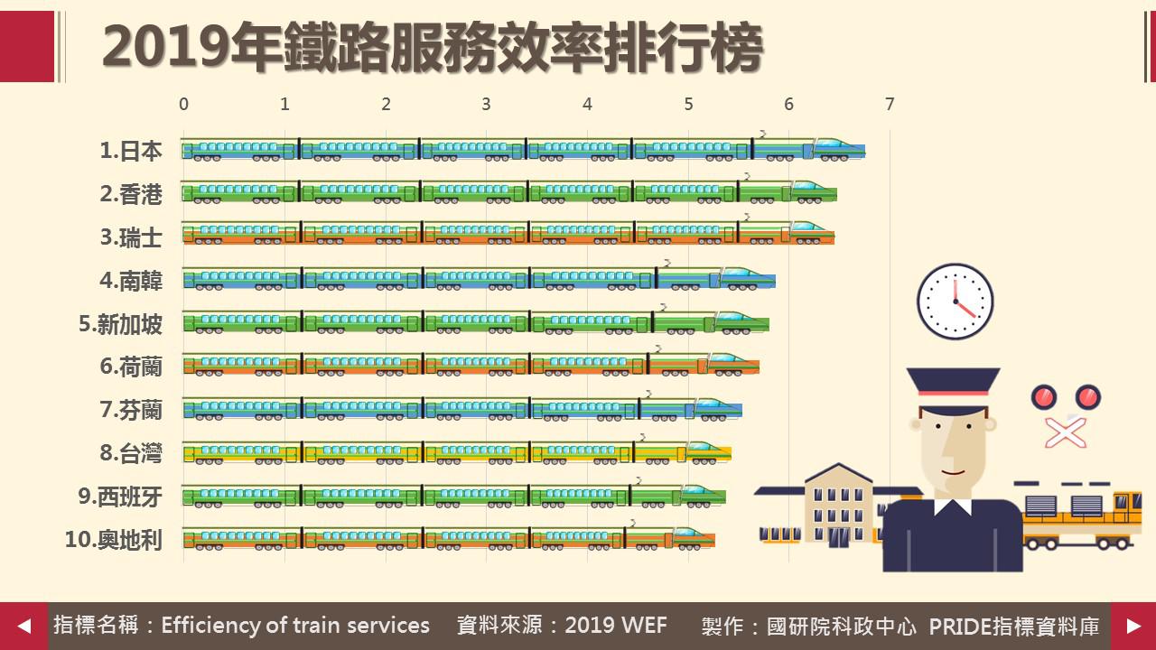 完善的基礎建設對於確保經濟有效運轉是至關重要的,而有效的運輸方式如公路、鐵路、港口、機場等也使企業能安全且及時地將其商品和服務推向市場,並同時促進人才的流動。因此世界經濟論壇(WEF)針對2019年世界各國的鐵路服務效率進行意見調查,評估項目包括火車運輸服務的頻率、準點、速度和價格等。評估成績以7分最高,代表該國火車運輸服務的效率極高,1分則代表效率極差。毫無疑問地,日本以其聞名全球的高準點率及網絡發達在2019年以接近滿分的6.76分拿下世界鐵路服務效率的冠軍,其次為地狹人稠但鐵路網絡四通八達的香港(6.47分),而2018年的冠軍瑞士則以6.45分的成績被擠到第3名,其他依序為南韓、新加坡、荷蘭、芬蘭,台灣則在2019年以5.29分的成績擠下美國、德國、西班牙,位列全球第8名。