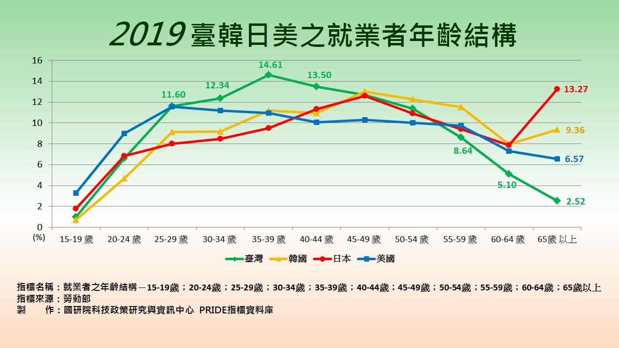 根據勞動部就業者年齡結構的指標數據,與韓國、日本、美國相較,2019年我國就業者年齡分布所占比例,從青年時期的25-29歲(11.6%)起,到30-34歲(12.34%)、35-39歲(14.61%),以至壯年時期的40-44歲(13.5%)都居4國之冠,此後隨著就業者的年紀漸長,所占比率一路下滑,逐漸落後其他3國,到55-59歲(8.64%)、60-64歲(5.1%)已為4國之末,65歲以上(2.52%)之就業者比例更大幅落後於日本(13.27%),也低於韓國(9.36%)與美國(6.57%)。
