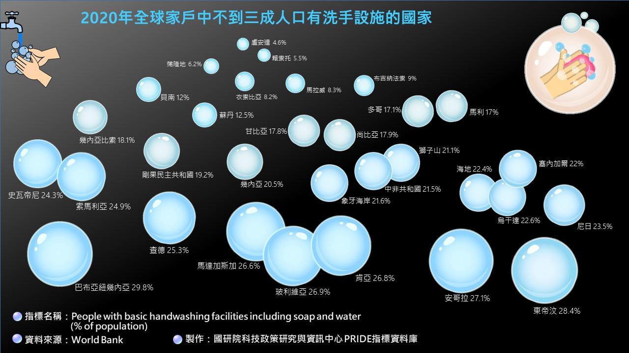「家戶中具有基本洗手設施的人口比例」是指居住在有洗手設施的家庭中的人口比例,指在家庭中提供肥皂(包括皂塊、液體肥皂、洗衣粉、肥皂水等)和水(包括帶自來水的水槽、水龍頭、水壺或水盆)的洗手設施。2020年全球家戶中不到三成人口有洗手設施的國家,大部分位於撒哈拉以南的非洲國家,其中盧安達僅有4.6%的人口家戶中有洗手設施,位於中南美洲的海地(22.4%)、玻利維亞(26.9%)、位於亞洲的東帝汶(28.4%)、位於大洋洲的巴布亞紐幾內亞(29.8%),也是不到三成人口家戶中有洗手設施的國家。若放眼全球2020年78億人口中,55億人口(71%)家戶中有基本的洗手設施,16億人口(21%)家戶中缺乏基本洗手設施,6.7億人口(9%)家戶中根本不具任何洗手設施。