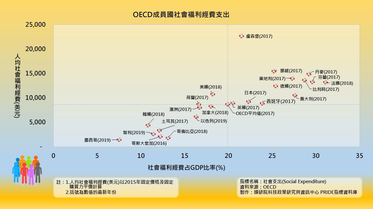 OECD成員國中,人均社會經費最高前5名國家,第一名是盧森堡,每人平均22,664美元,第二名是挪威(15,482美元),第三名是是丹麥(14,854美元),第四名是奧地利(13,992美元),第五名是比利時(13,602美元);投入經費最低的三名國家,以墨西哥最低,每人平均僅有1,421美元,第二名是哥倫比亞(1,807美元),第三名是哥斯大黎加(2,095美元)。