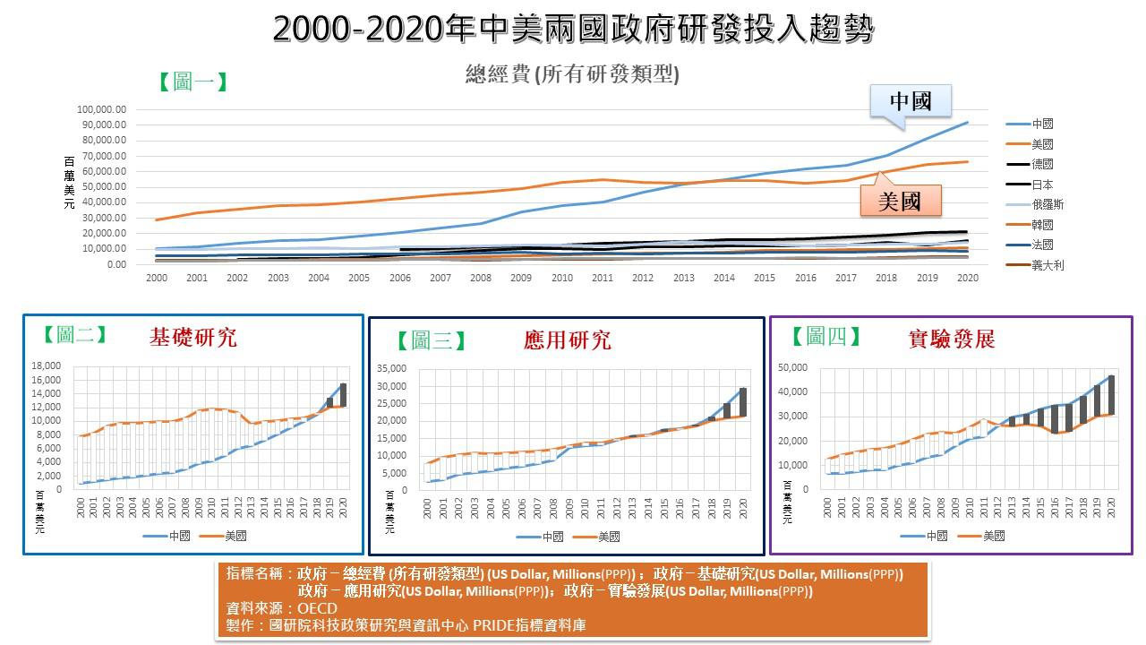 根據OECD從2000年到2020年政府在研發投入之總經費觀察,中國與美國都是保持成長並遙遙領先各國的趨勢。以2000年為例,中國的研發經費為103億美元(購買力平價),美國為290億美元(購買力平價),美國的研發投入約為中國的3倍。隨著時間推移,中國在2014年以547億美元(購買力平價)超越了美國的541億美元(購買力平價),並在2021年達到1,020億美元(購買力平價),約是美國的1.5倍。(如圖一)