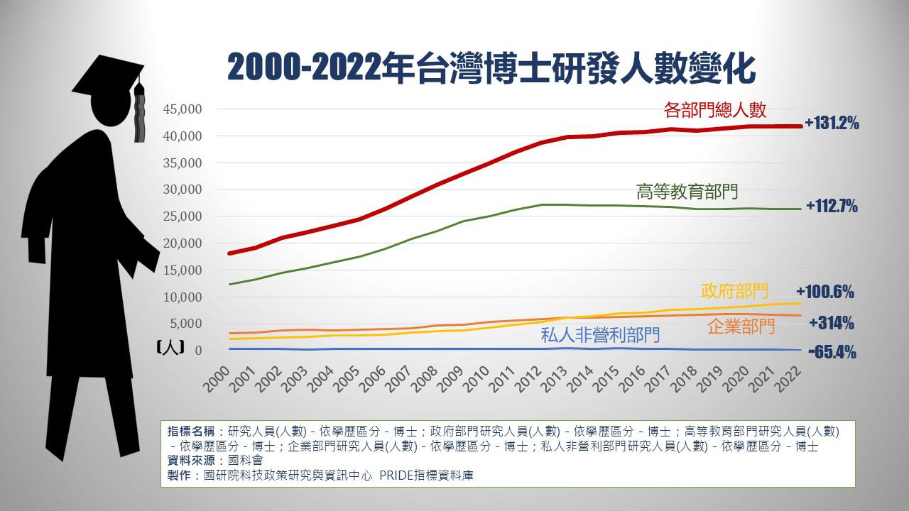 觀察各部門博士研發人數,平均以高等教育部門的人數最多,而私人非營利部門最少。高等教育部門的博士研發人數,由2000年的12,399人增至2022年的26,376人,成長率為112.7%。政府部門的博士研發人數從2000年的3,258人增至2022年的6,536人,增幅達100.6%。企業部門的博士研發人數雖較少,但呈現相對強勁的成長,由2,117人增至8,765人,成長率高達314%。相反的,私人非營利部門的博士研發人數則有所減少,由295人減至102人,成長率為-65.4%。