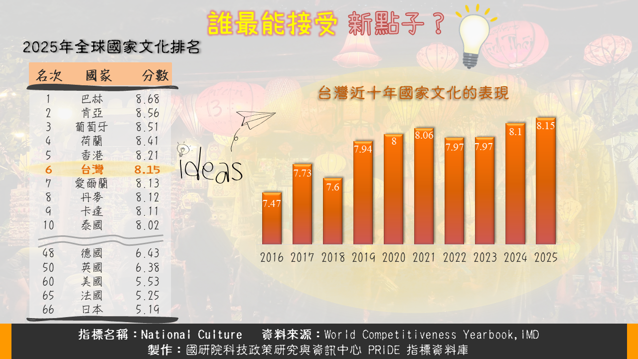 「國家文化」不僅僅只是單純的歷史傳統或藝術表現,在IMD世界競爭力年報的指標中,「國家文化」指標更聚焦於一個社會對於外來文化與新觀念的開放程度。簡單來說,就是社會對「新點子」的包容度。若一國的文化封閉,便可能與世界脫節;反之,則能像海綿般吸收多元養分,激發出無限創意、吸引全球頂尖人才與投資,讓社會充滿活力。