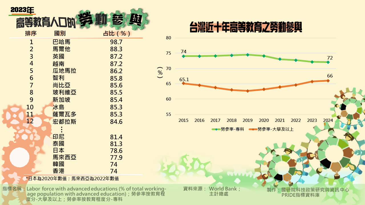 根據世界銀行的統計數據,2023年各國之高等教育人口的勞動參與率,前十二高的國家如左表所示,依序為巴哈馬98.7%、馬爾他88.3%、英國87.2%、越南87.2%、瓜地馬拉86.2%等,涵蓋各大洲與不同經濟發展程度的國家,其中尚比亞、玻利維亞、宏都拉斯等屬非知識密集型經濟體,因高等教育人口基數相對小,高等教育背景在當地非常稀缺,這群「菁英」幾乎都進入勞動市場,因而比率都在80%以上;而巴哈馬、馬爾他、英國、新加坡、冰島等高收入國家,比率高表示著高學歷人口多數積極參與勞動力,且教育體系與市場需求銜接緊密,經濟體亦提供足夠的就業機會。亞洲國家如印尼及泰國,占比都在81%以上,而日本(78.6%)、馬來西亞(77.9%)、韓國(74%)、香港(74%)占比則在七成以上。