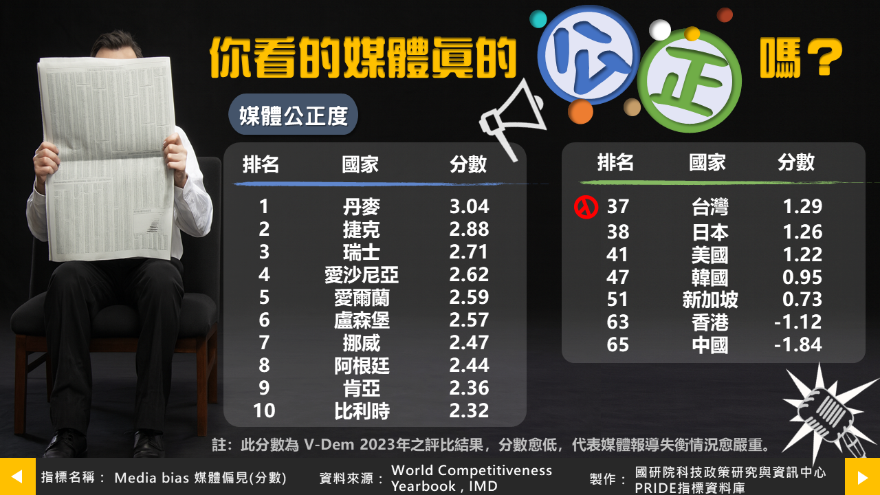 在資訊爆炸的時代,我們每天接觸大量新聞內容,卻忽略了媒體報導的角度正悄悄左右我們的判斷。特別在選舉期間,媒體若偏向某一政黨,資訊就容易失真,而在錯誤資訊下所作出的政治選擇,不僅可能造成政策搖擺與社會分裂,甚至會影響外資對該國的信心。新聞媒體作為監督政府的第四權,不只是傳遞消息的工具,更是形塑社會共識的重要力量。有鑑於此,瑞士洛桑管理學院(IMD)在2025年首度將「媒體偏見(media bias)」納入國家競爭力的評比項目。該指標係由民主多樣性研究所(V-Dem Institute)所建構,由多位專家針對各國大眾傳媒(包括平面媒體及廣播媒體)是否能依新聞價值比例、公正且適度地報導所有重要政黨與候選人進行評價。分數愈低,代表媒體偏見嚴重,報導的失衡狀況愈明顯;分數愈高,代表媒體報導相對平衡,資訊環境健康度較佳。