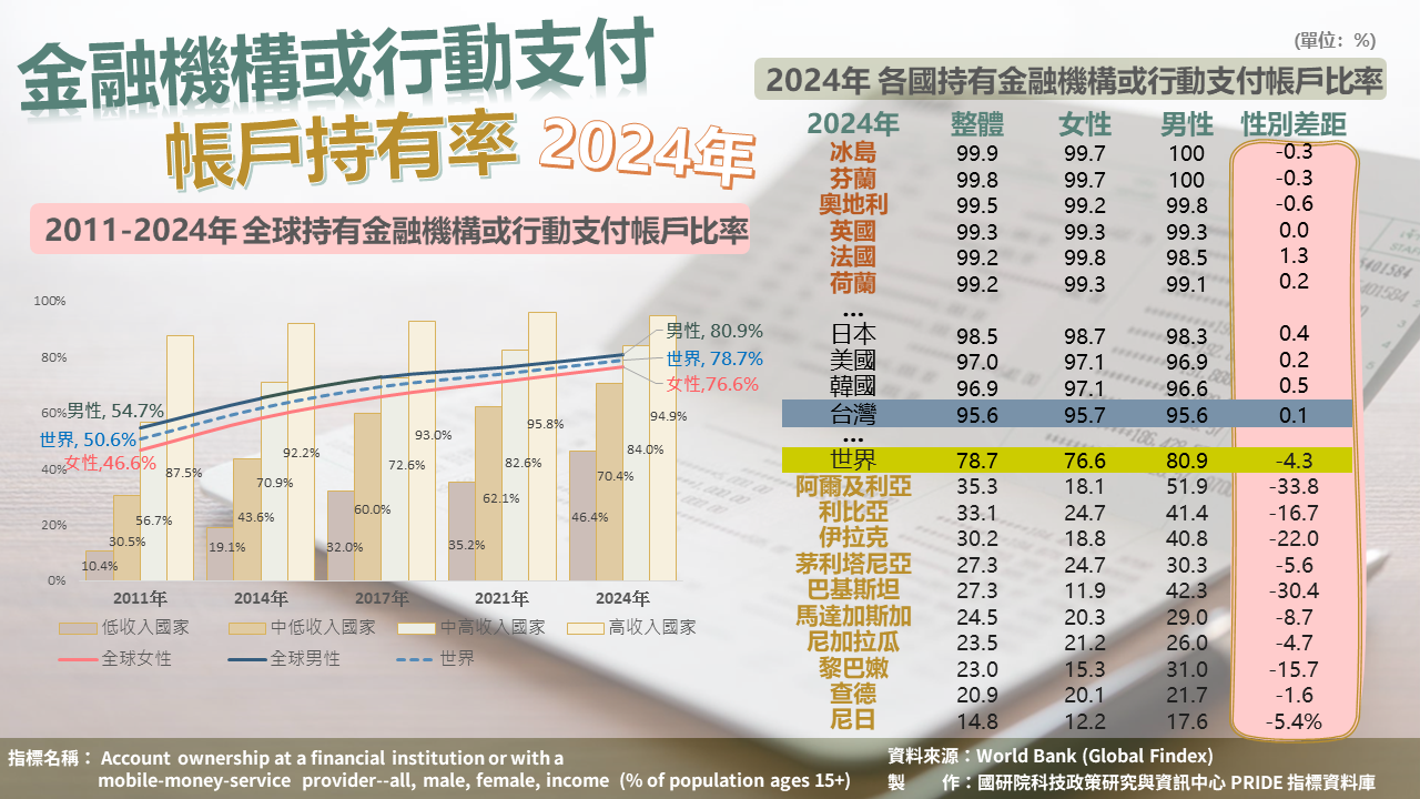 回顧整體,根據世界銀行2011-2024年數據發現,2011年僅有46.6%女性擁有金融帳戶,至2024年已有大幅成長至76.6%,但仍明顯低於男性的80.9%;國家之間也有明顯差距,高收入國家的金融帳戶持有率在2024年已高達94.9%,而低收入國家人民的金融帳戶持有率,僅從2011年10.4%緩慢爬升至2024年46.4%,遠遠低於全球78.7%的平均水準。