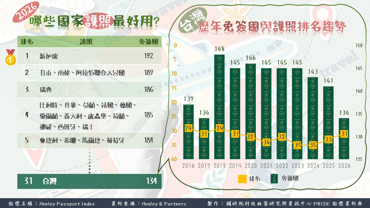 Henley & Partners (恆理護照指數)是以免簽目的地數量為評比標準,用來衡量各國護照的「含金量」,免簽數越多,代表國際認可度越高、跨國移動成本越低,能更有效促進國際間的經濟貿易與文化交流。