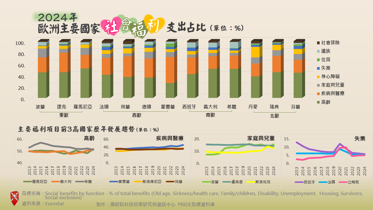 社會福利是指社會安全計畫,以現金或實物形式向家庭和個人提供的轉移支付,旨在減輕國民因特定風險或需求而造成的負擔。歐盟統計局(Eurostat)的「各類社會福利支出占總福利支出比例」指標,反映了歐洲各國社會安全網的權重配置,其社會福利支出分為8項類別,分別為:1.失業(Unemployment):提供失業給付、職業訓練與再就業支持;2.家庭與兒童(Family/children):如育兒津貼、托育補助,是「催生」的關鍵;3.住房(Housing):提供租金補貼、社會住宅支出;4.遺族(Survivors):配偶或家屬身故後的撫卹與經濟支持;5.高齡(Old age):各類退休金、養老年金;6.身心障礙(Disability):失能或身障者補助;7.疾病與醫療(Sickness/health care):醫療服務、藥品補貼與病假給付;8.社會排除(Social exclusion):針對貧窮、弱勢族群的綜合性支援。從這些指標的分佈,不只單純的看到「誰花得多」,還可從中窺伺各國對不同社會風險的重視程度、社會福利政策傾向與社會安全網的設計邏輯。